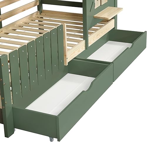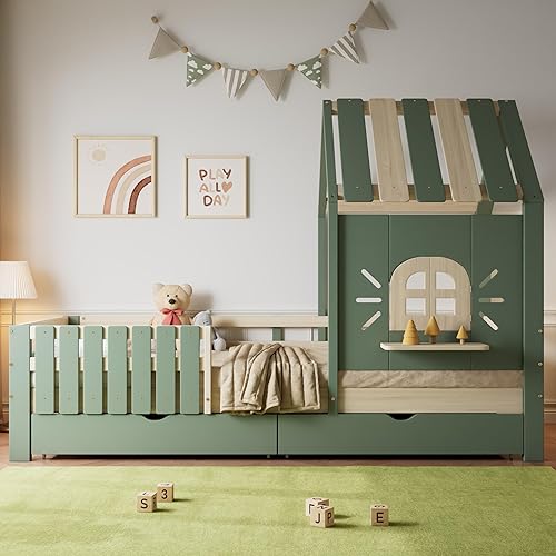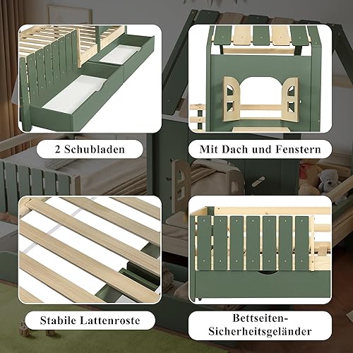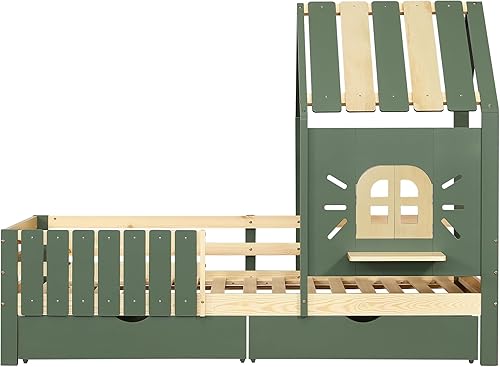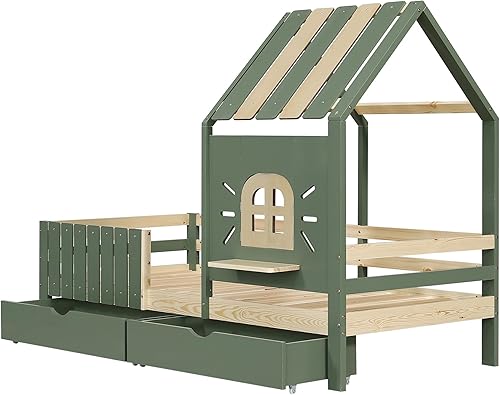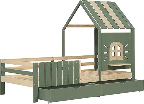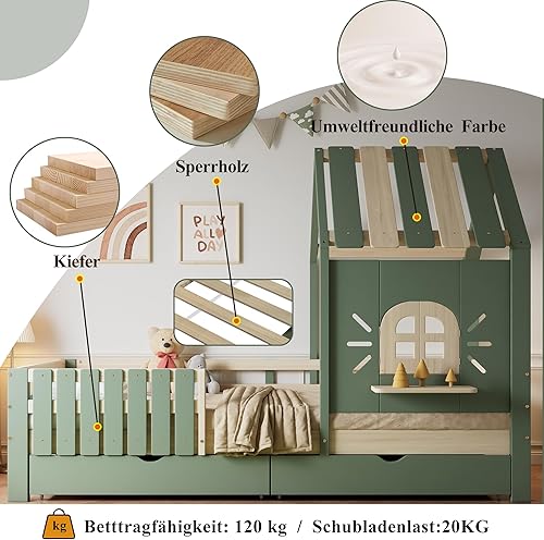 Seyakany Lit Cabane Enfant 90x200cm avec 2 Tiroirs de Rangement, Lit Montessori avec Toit et Fenêtre, avec Rebord de fenêtre en Bois, Clôture à Quatre côtés, Structure en Pin + MDF, Vert+Naturel
