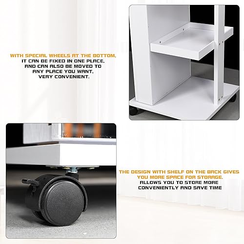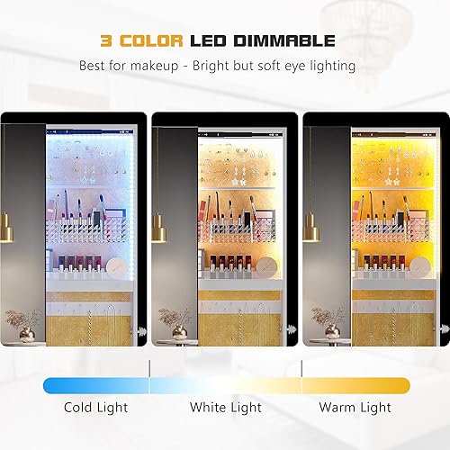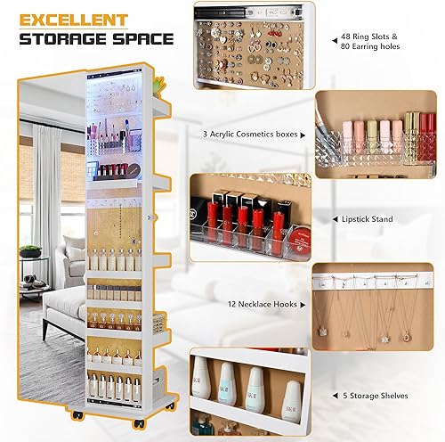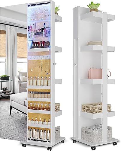 Figbird Armoire à bijoux LED rotative à 360 °,trois couleurs à intensité variable,avec miroir sur toute la longueur,organisateur de bijoux 4 roulettes et compartiment de rangement arrière Blanc
