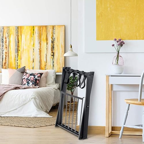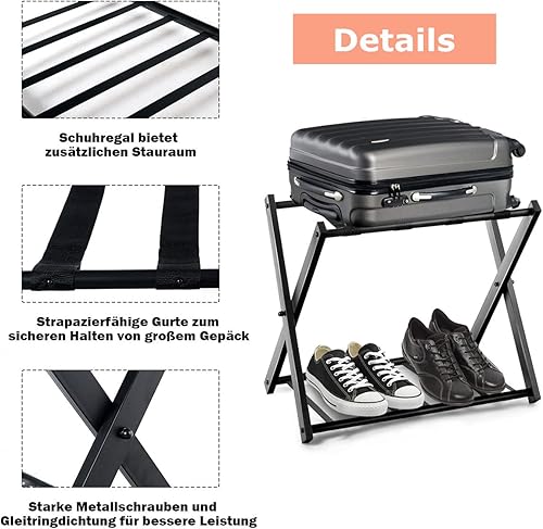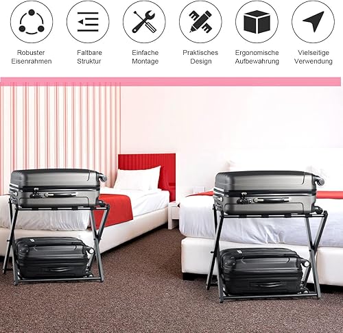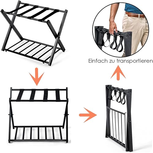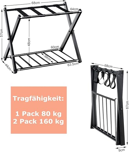 RELAX4LIFE 2 Porte-Bagage Valises Pliable en Métal 68x44x57cm, Support de Valise Porte-valises Pliant avec 2 Étages & 4 Sangles, Support Sacs de Voyage Noir pour Hôtel Chambre Noir (2 paquet)