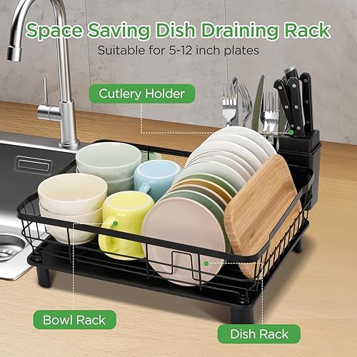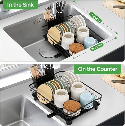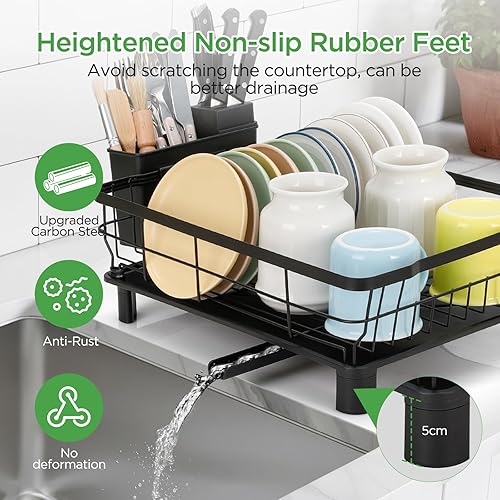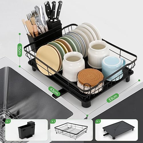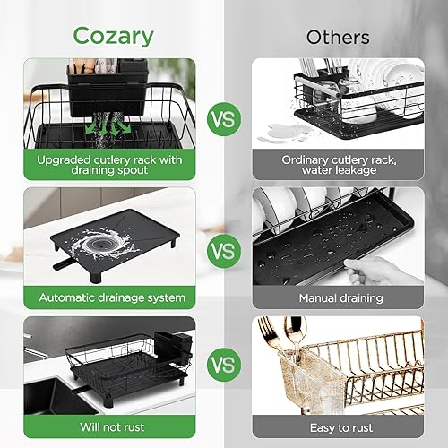 Cozary Egoutoire Vaisselle Cuisine avec Bec Rotatif 360°, Égouttoir à Vaisselle avec Porte-ustensiles, Range Vaisselle Egouttoir en Acier Carbone avec Drainage Automatique(43x33x15cm)