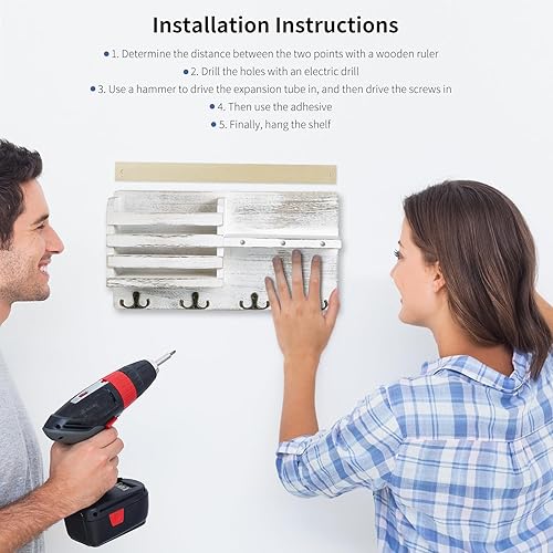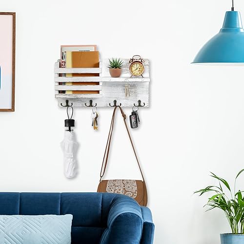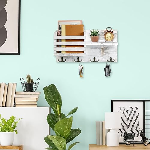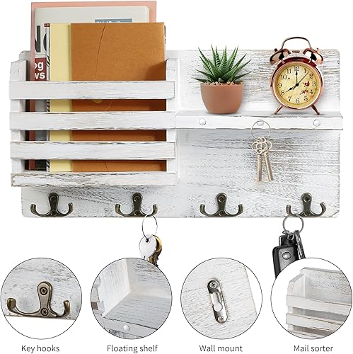 Comius Sharp Porte Clef Mural, Porte-Clés Mural en Bois, Noir Porte Courrier Mural, Avec 4 Crochets à Clé Doubles, pour Salon, Salle de Bain, Cuisine, Les Entrées, Couloirs(Blanc Vintage)