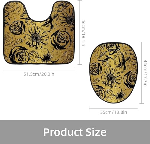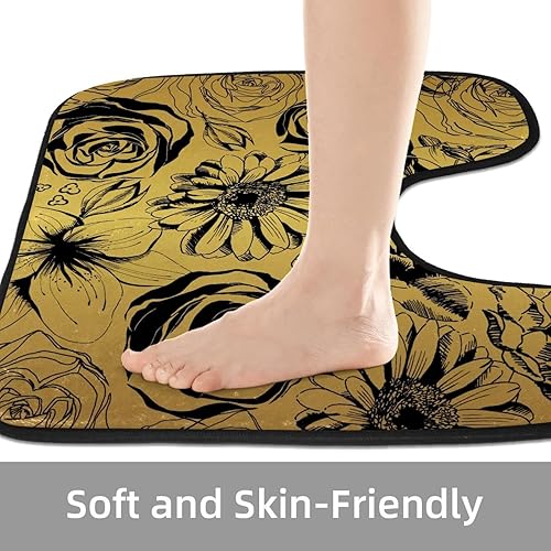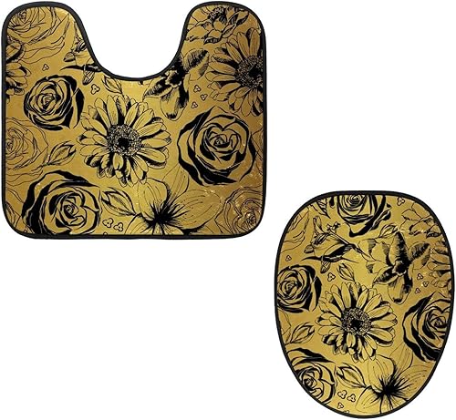 VAPOKF Lot de 2 tapis contour WC en forme de U et housse pour abattant de WC, tapis de salle de bain en flanelle douce et antidérapante, motif doré avec roses de tournesol noires