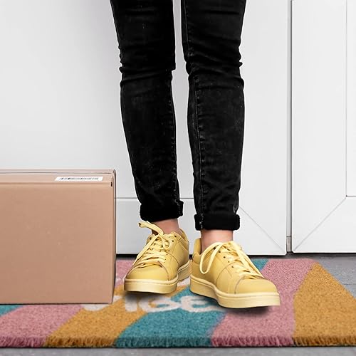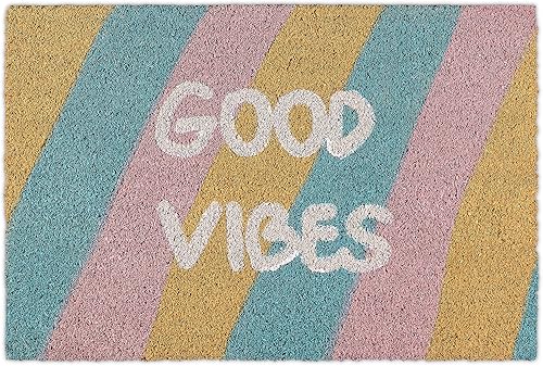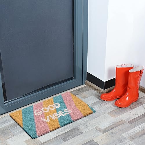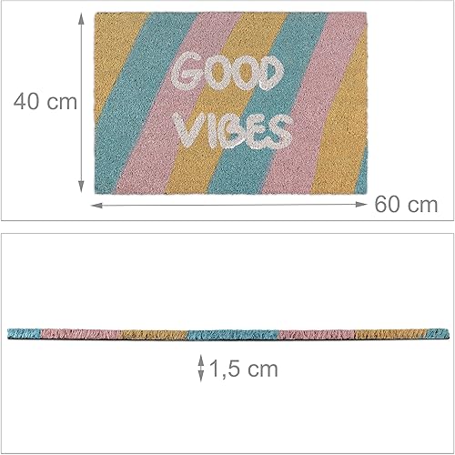Relaxdays Paillasson Coco, Tapis d’entrée «Good Vibes», rayé, antidérapant, intérieur & extérieur, 40 x 60 cm, coloré