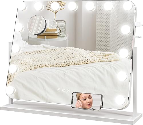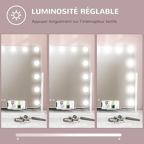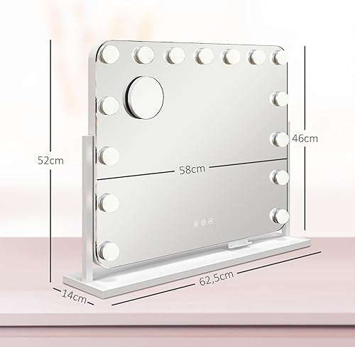 HOMCOM Miroir Maquillage Hollywood Lumineux, Miroir Coiffeuse avec 14 LED dimmables, Glossissant 10X et Charge USB, Support de téléphone, Rotation à 360° - 63 x 50 cm
