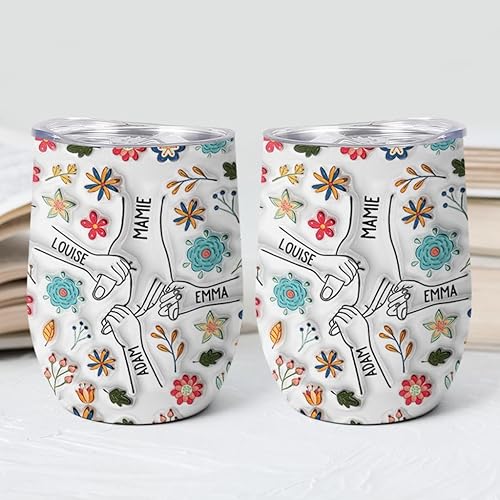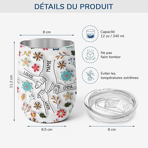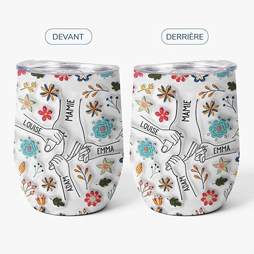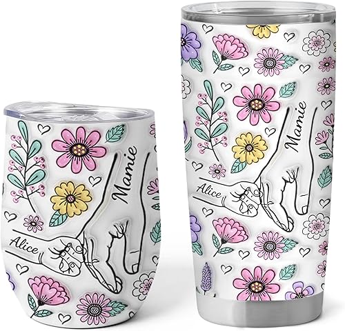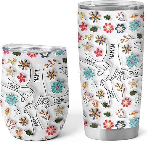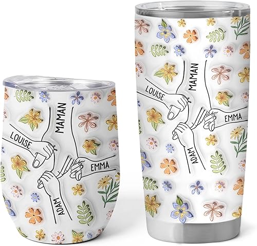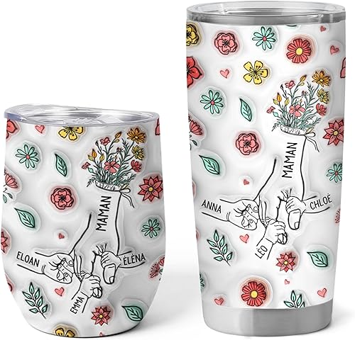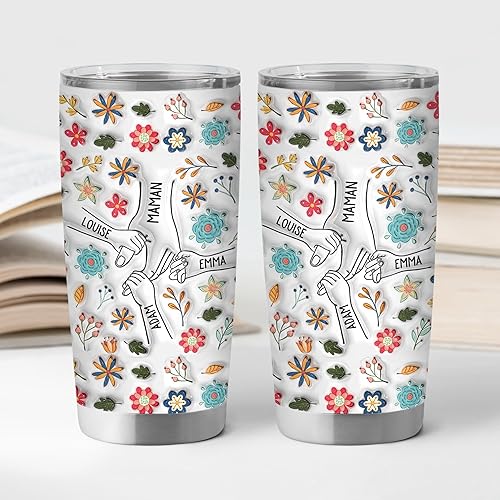 Cadeau Plus Mug Isotherme Personnalisable Prénom - Maman/Mamie Tenant Les Mains Avec Fleurs Pastels - Mug Thermos Personnalisé, Thermos Personnalisable, Tasse A Cafe Isotherme (Modèle #4)