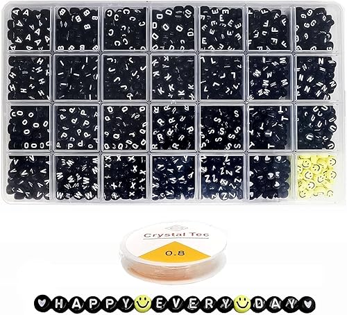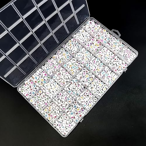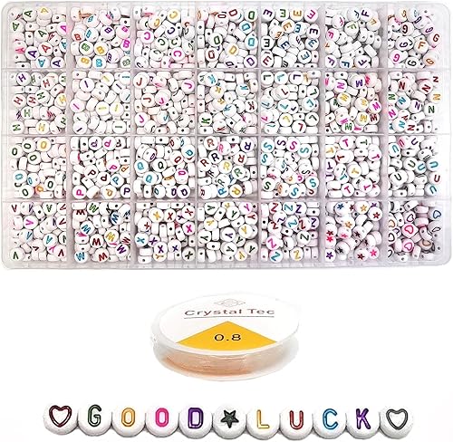 Bestac Lot de 1280 perles rondes avec lettres de l'alphabet de A à Z et ligne de cristal pour bracelets, colliers, loisirs créatifs, fabrication de bijoux (lettre colorée, blanc)