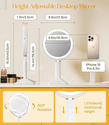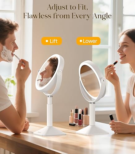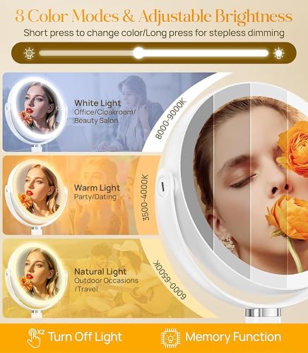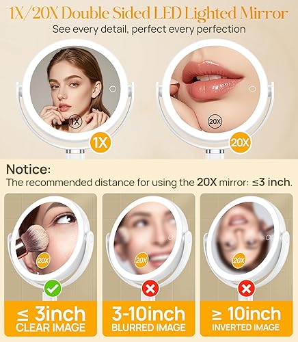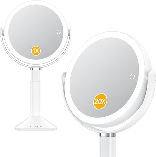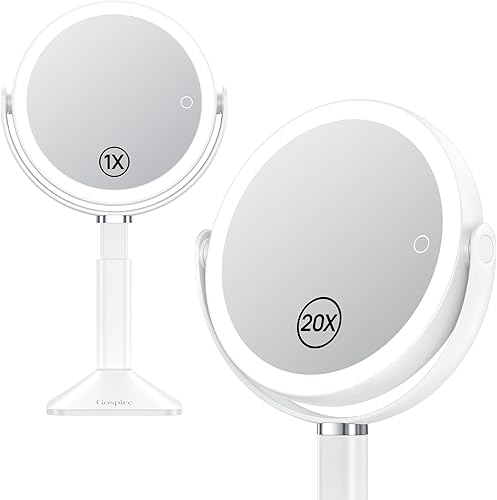 Gospire Miroir de maquillage lumineux avec lumières et grossissement 20x, hauteur réglable, batterie rechargeable de 4000 mAh et 3 lumières à intensité variable colorées, miroir de courtoisie lumineux