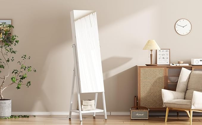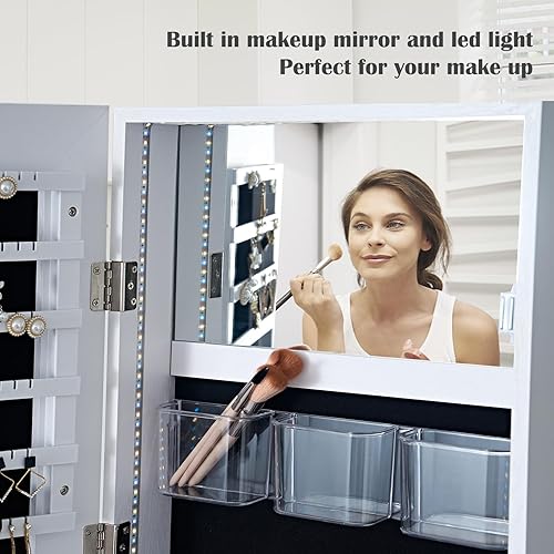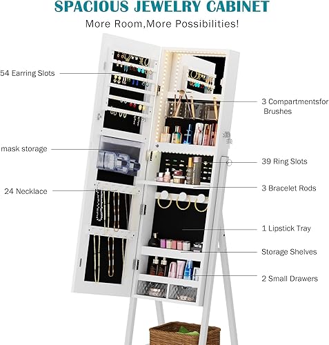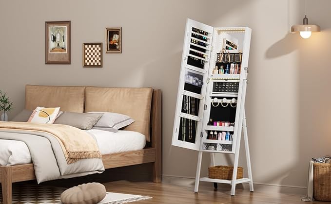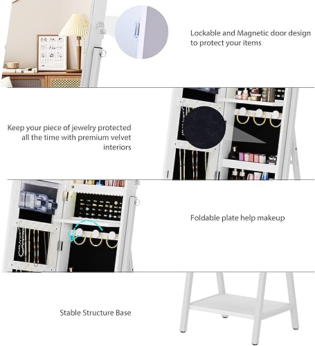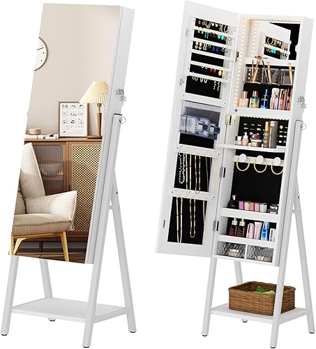 soges Armoire à Bijoux sur pied avec Étagère de Rangement, Armoire à Bijoux Verrouillable, Armoire à Bijoux avec Miroir à Pleine Longueur, Porte-bijoux avec Miroir, Blanc