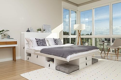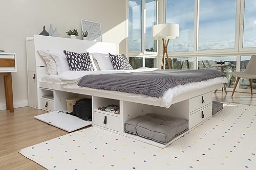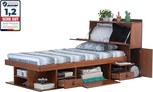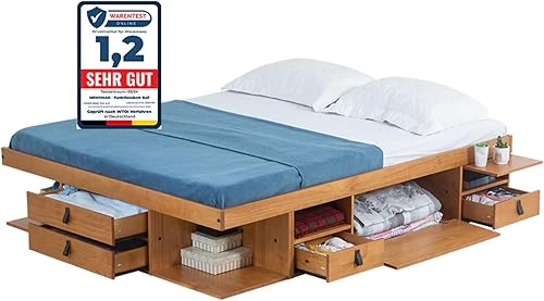 Grand Rangement | Design Moderne & Fonctionnel | Bois Massif & Poignées Cuir | Lit Petites Chambres | Robuste & Élégant | Montage Facile | Lit avec Sommier (140x190cm, Caramel)