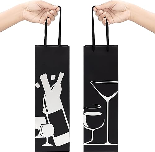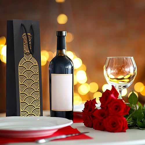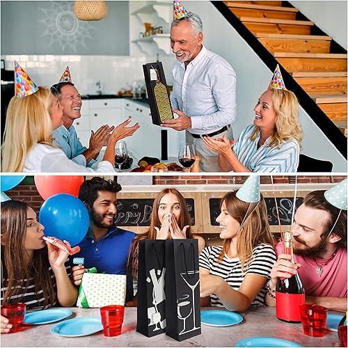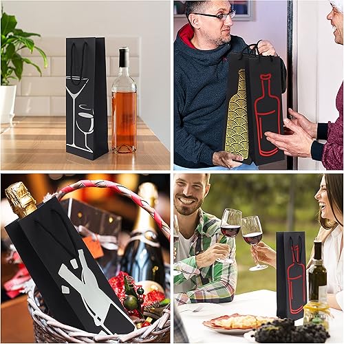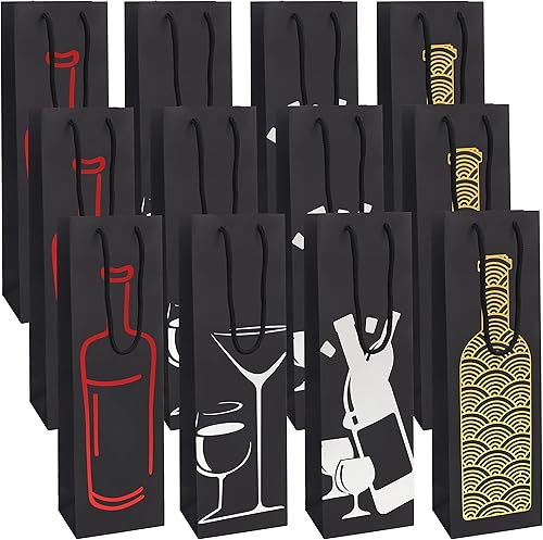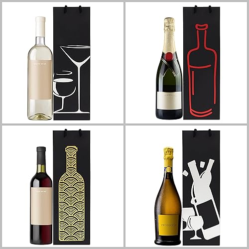 BELLE VOUS Sac Cadeau Bouteille de Vin Noir (Lot de 12) - 4 Motifs - Etui Cadeau Bouteille avec Poignées à Corde - Emballage Champagne ou Bouteille pour Anniversaires, Dîners et Crémaillères