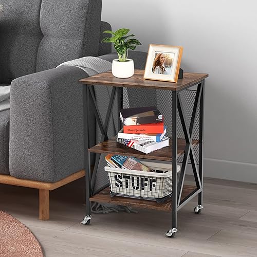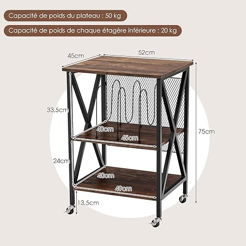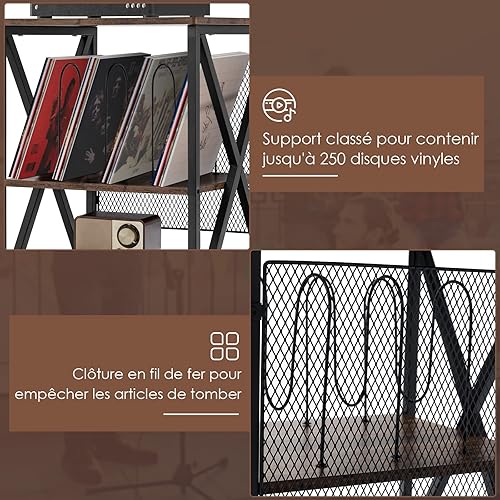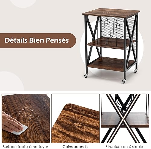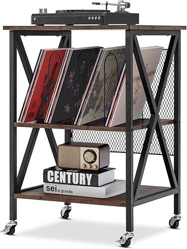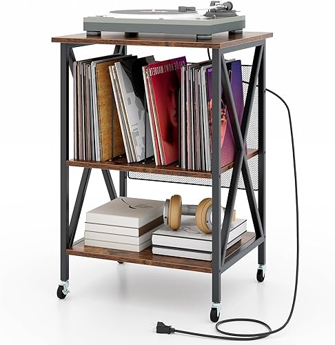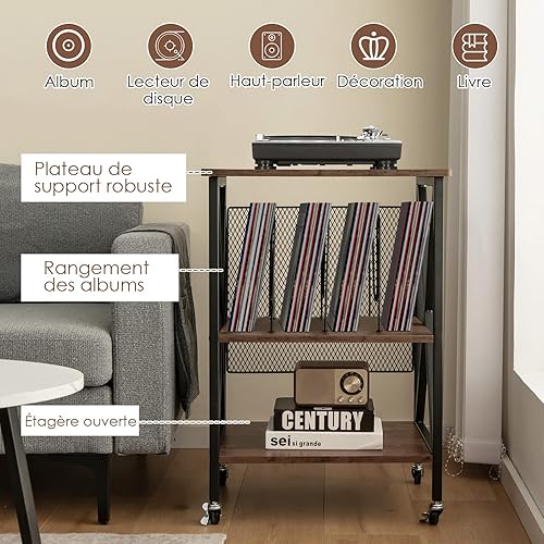 GOPLUS Meuble Vinyle Platine à 3 Niveaux avec Station de Charge, roulettes Verrouillables, Cadre en Métal, Table d'Appoint pour 250 Vinyles pour Salon, Bureau, 52x45x75cm (Marron Rustique)