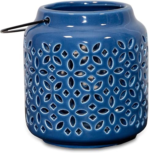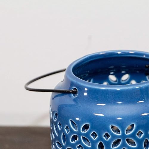 Antikas - Photophore en céramique bleu foncé avec anse de transport.