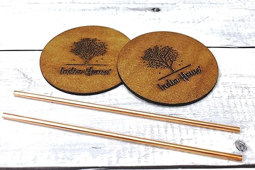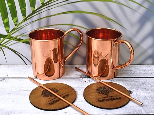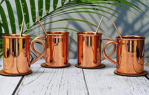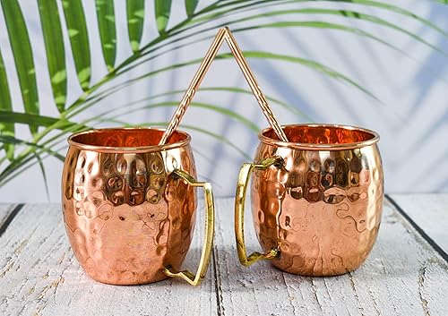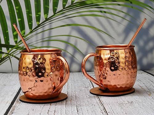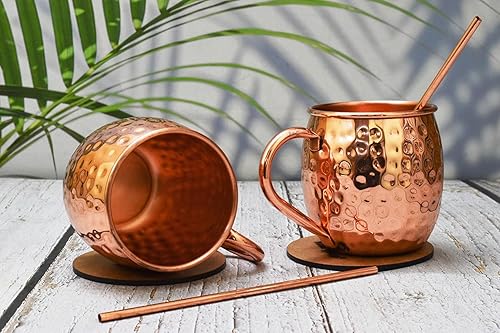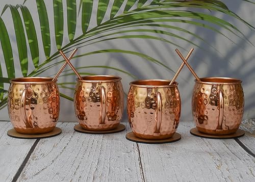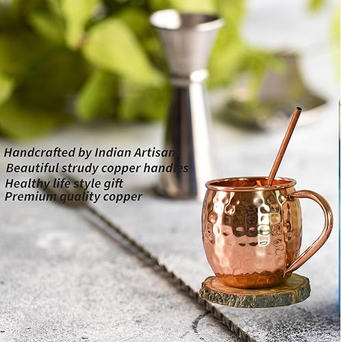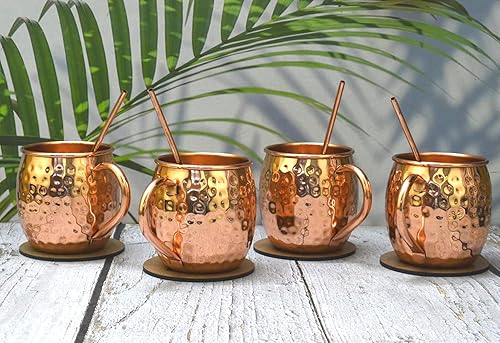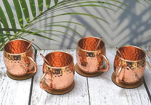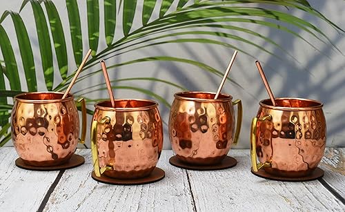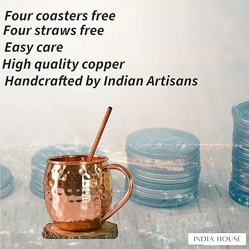 India House - Moscow Mule Set of 4 Cocktail Cups - 100% Copper with Brass Handle - Copper Drinkware - (Set of 4 Hammered Cups - Brass Handle (4 Coasters, 4 Straw free))