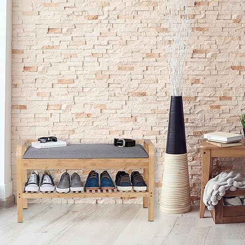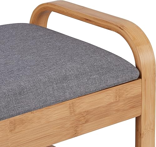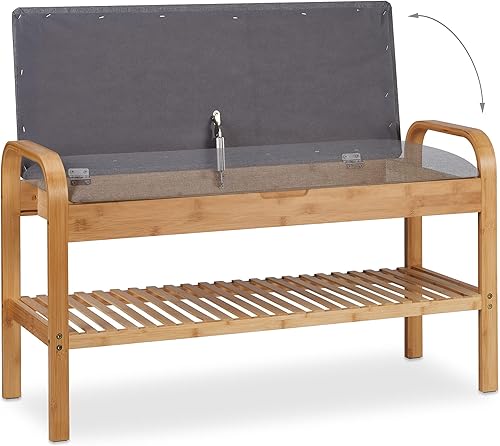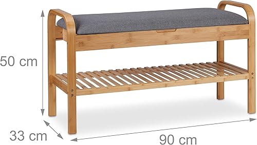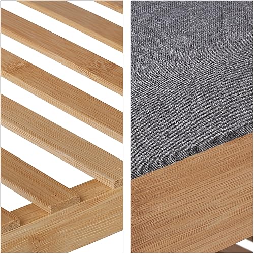 Relaxdays Banquette à Chaussures, 4 Paires, HxLxP 50x90x33 cm, Assise matelassée, Espace Rangement, Bambou, Nature/Gris