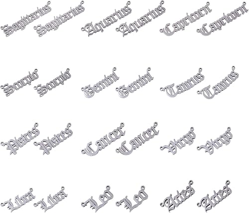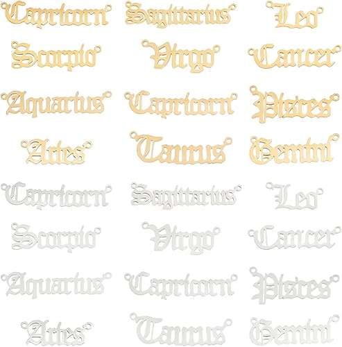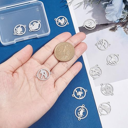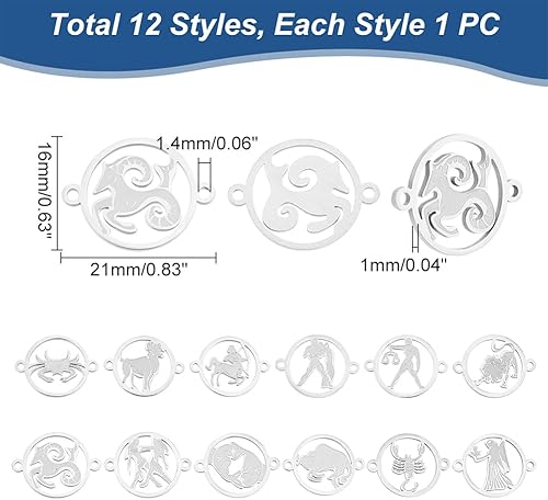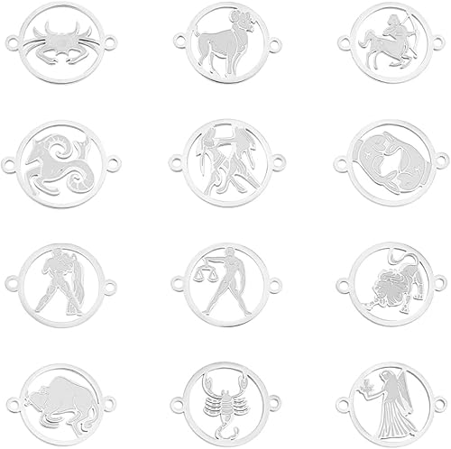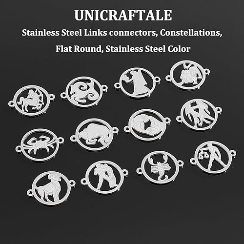 UNICRAFTALE 12 pièces Signe du Zodiaque Creux en Acier Inoxydable Breloques de Liaison Plat Rond avec Constellations Liens Connecteurs pour la Fabrication de Bijoux, 1.4mm trou, Couleur Inoxydable