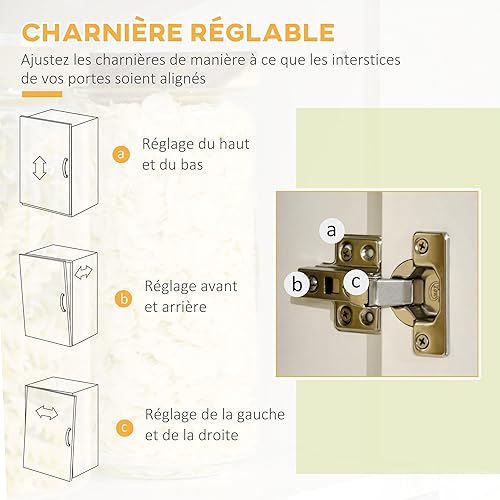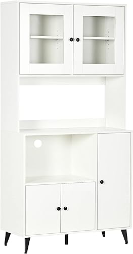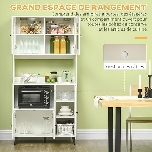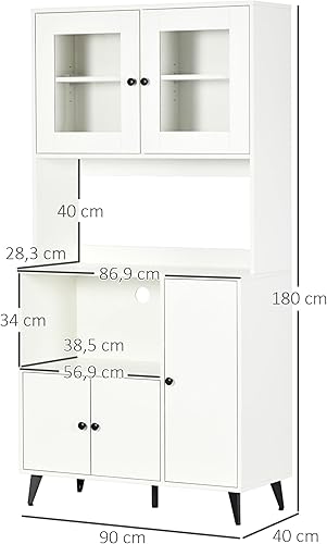 HOMCOM Armoire de Cuisine Buffet Cuisine Meuble de Rangement avec 3 placards, niches, étagères réglables, Portes vitrées, Passe-câble, Meuble Micro Onde pour Salle à Manger, Salon, 90x40x180cm, Blanc
