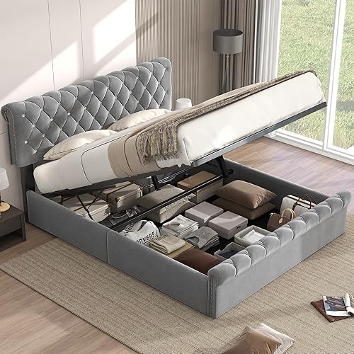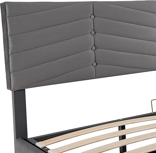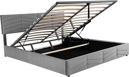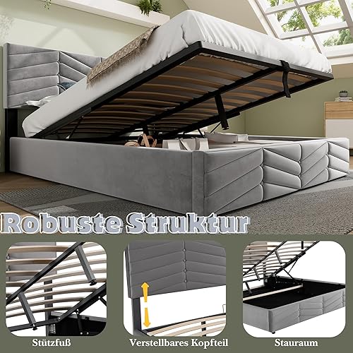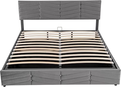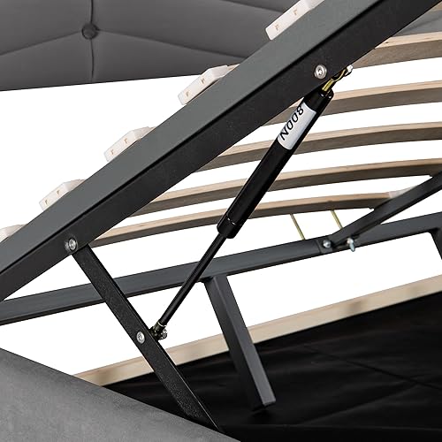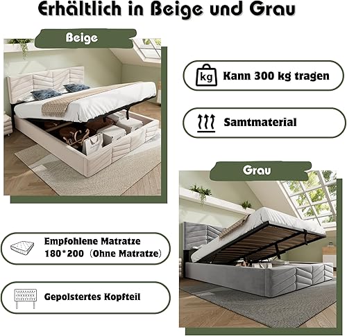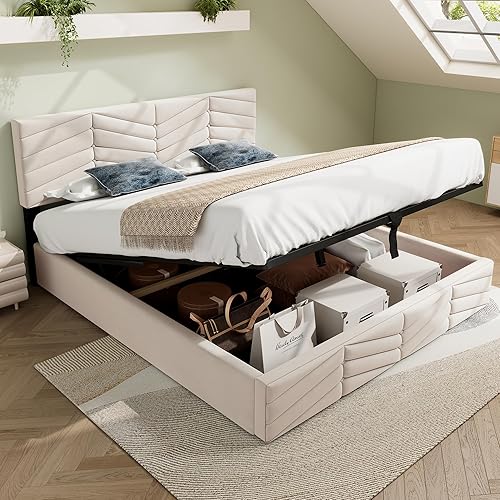 Merax Lit Capitonné Double 160 x 200 cm - Hydraulique Avec Sommier à Lattes, Coffre de Rangement et Tête de Lit Haute - Pour Adultes et Adolescents - Lin, Beige, Sans Matelas