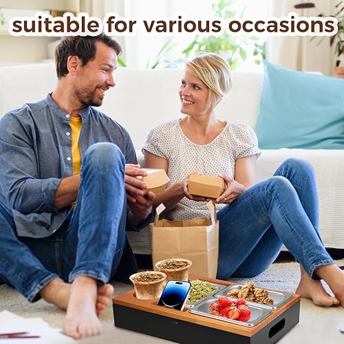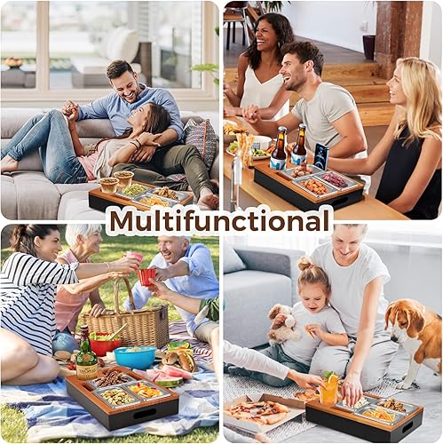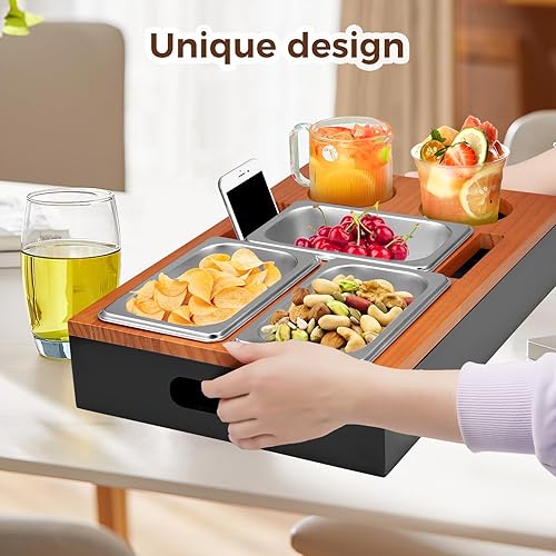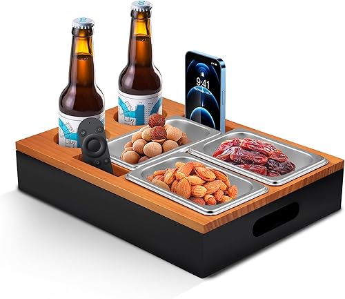 Canapé Bar Snack Box, Plateau de canapé, Plateau Bois, Plateau de Service Porte-Verre à Vin, Boîte à goûter, étagère à vin avec 2 Porte-Boissons, 3 Bols à collation en Acier Inoxydable