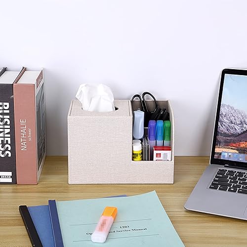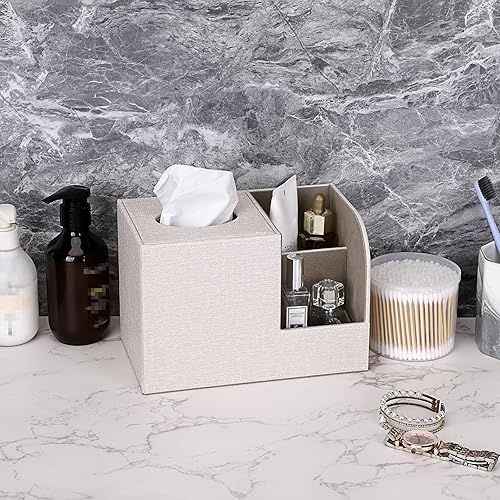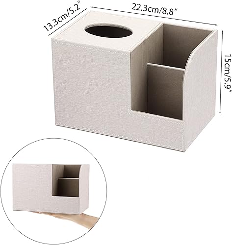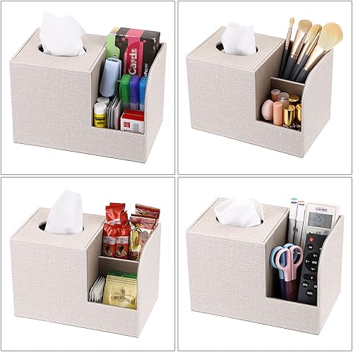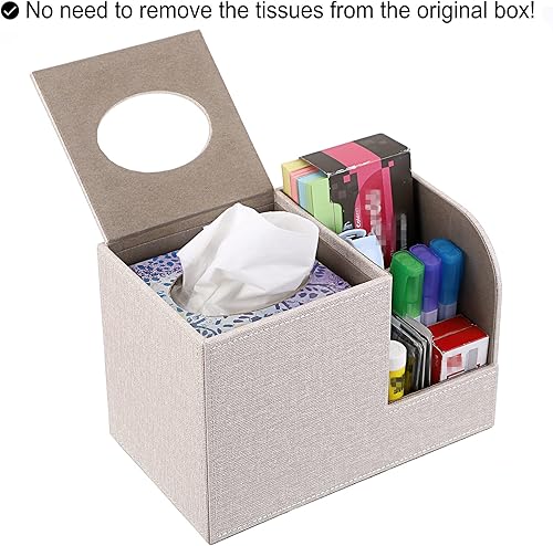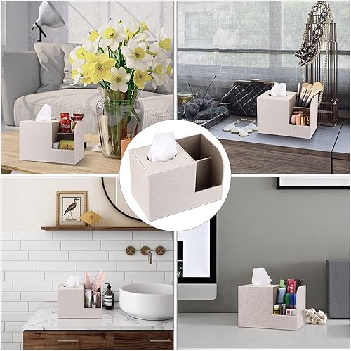 BTSKY Boîte à mouchoirs carrée en lin beige avec deux poches de rangement latérales pour télécommande, maquillage, cosmétiques, stylos, crayons – Boîte de rangement cube pour serviettes de table
