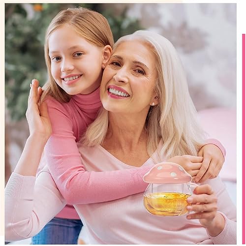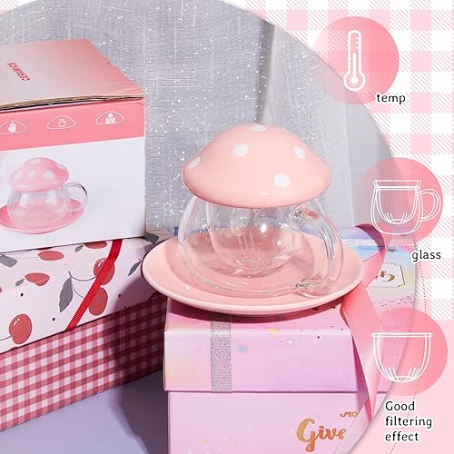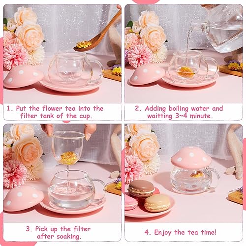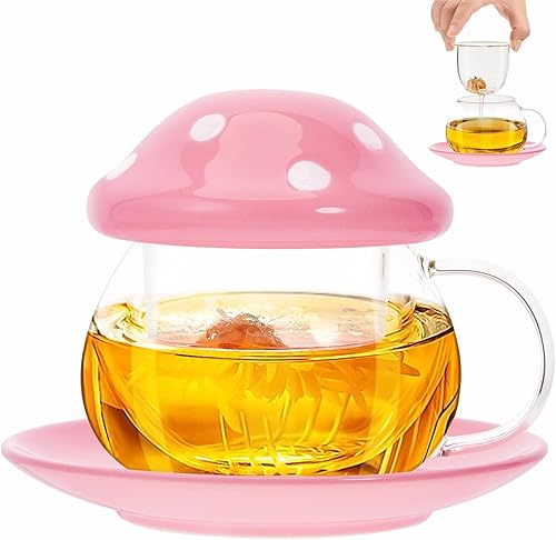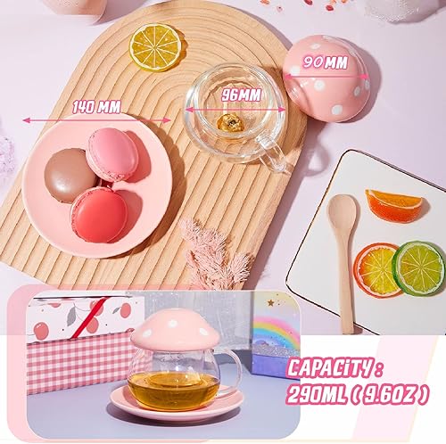 TUHNHGD Tasse Champignon Transparente, Verre à Cappuccino Avec Sous-Verre, Couvercle, Passoire à Thé, 290ml (Rose)