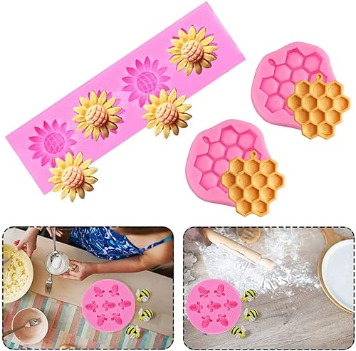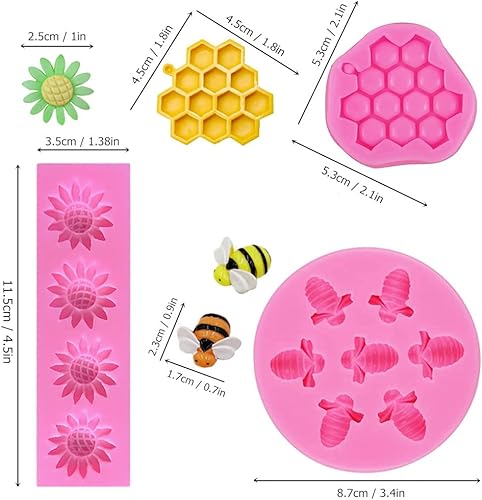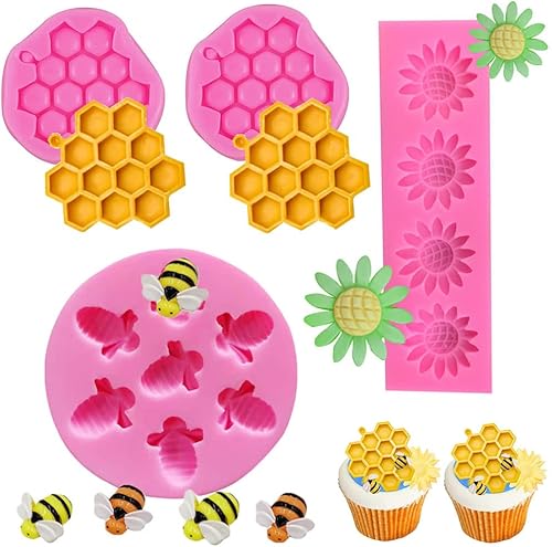 SamHeng 4 Pièces Fleur Abeille Moules en Silicone, Nid d'abeille Bourdon Moules à Chocolat pour Bonbons Fondant Décoration de Gâteau, Moule de Cuisson pour Artisanat d'argile Cupcake Toppers