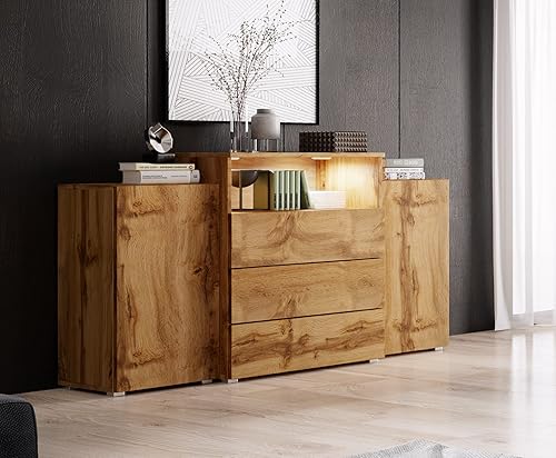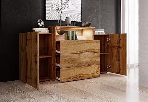 Commode Avec Tiroirs KORFU III, Dimensions du Buffet : 69-82 x 150 x 32,5-39 cm, Commode Chambre, Commode Salon, Commode Moderne en Panneau Stratifié avec LED - Chêne Wotan / Chêne Wotan