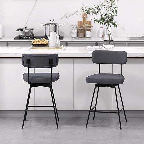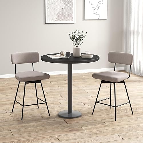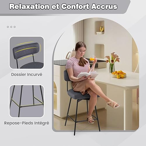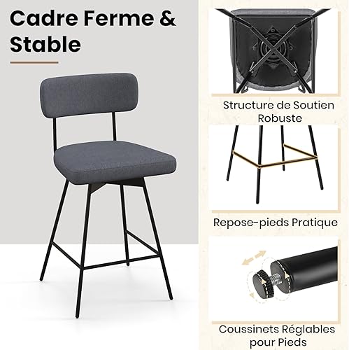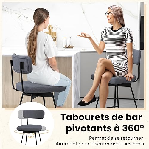 RELAX4LIFE Lot de 2 Tabouret de Bar Hauteur Assise 65 cm, Tabouret Bar 4 Pieds Pivotant, Chaise de Bar Rembourrée, Tissu de Lin, Dossier, Repose-Pieds, Cadre Métallique, pour Îlot Central (Beige)
