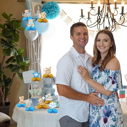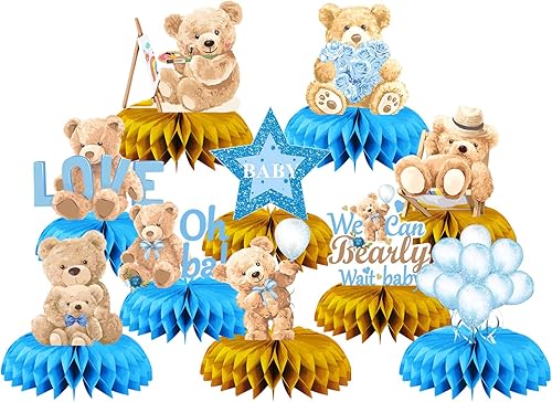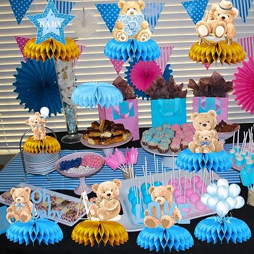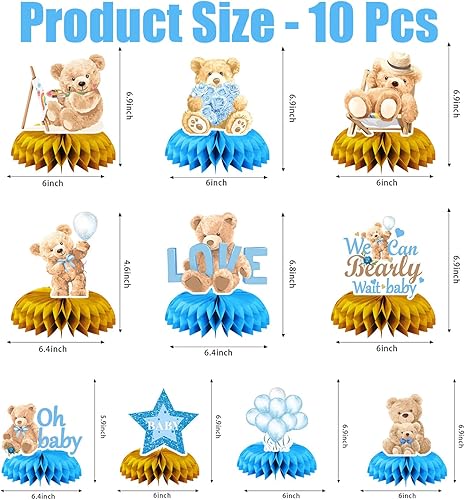Lot de 10 décorations de table en nid d'abeille pour fête prénatale, fête prénatale, fête prénatale - Marron et bleu