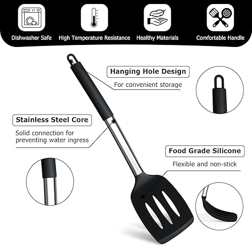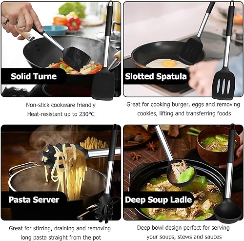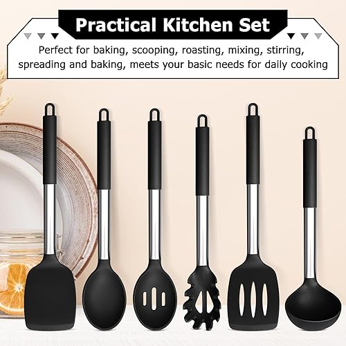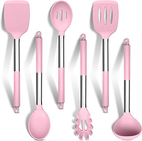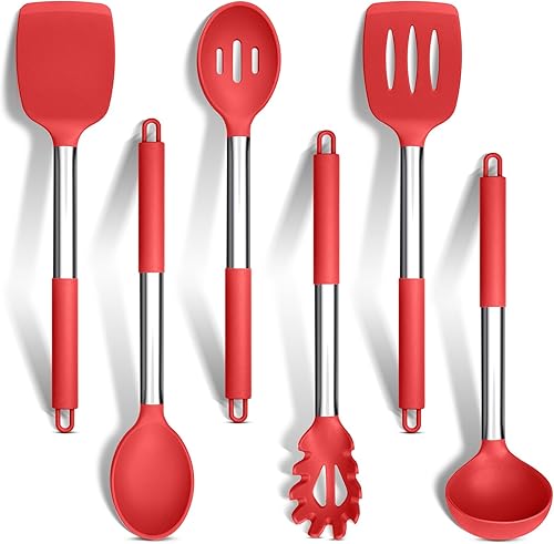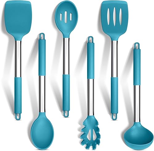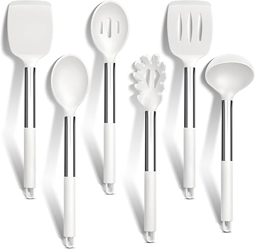 HaWare Lot de 6 ustensiles de cuisine en silicone blanc avec louche, spatule, cuillère à pâtes, ustensiles de cuisine résistants à la chaleur avec poignée en acier inoxydable, anti-adhésifs,