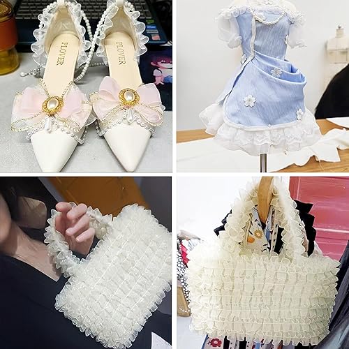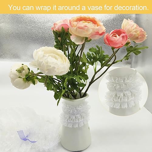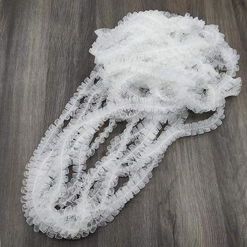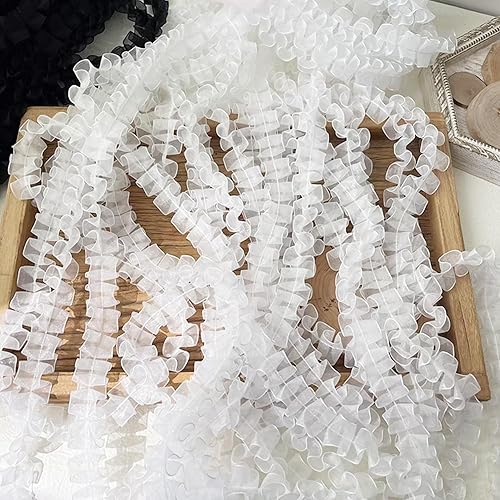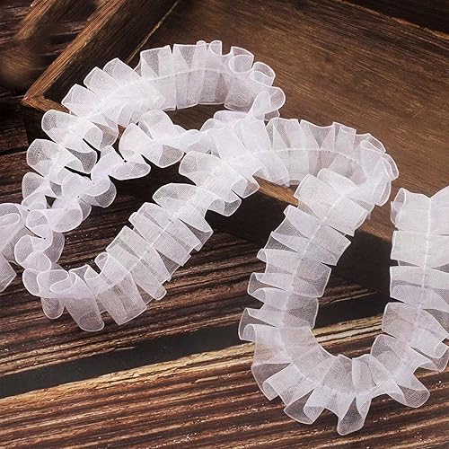 TUKEVA Ruban en dentelle plissée en organza - 13 m de long et 2,5 cm de large - Élastique - Pour bricolage, couture, artisanat, mariage, décoration de scrapbooking (blanc)