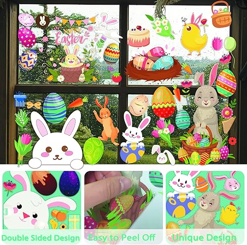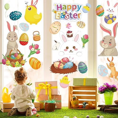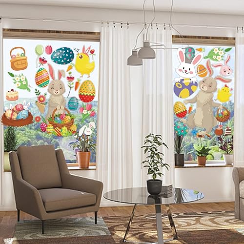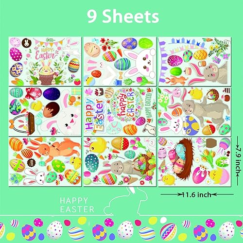 Paques Fenetre Autocollants,9 Feuilles Réutilisable Stickers Paques Enfant Electrostatique,Décorations de Pâques Oeufs et Lapin pour Porte Vitre,Vitrine,Autocollants en Verre Pour le Jour de Pâques