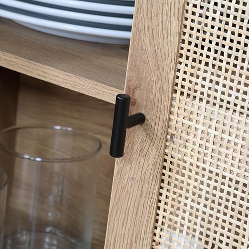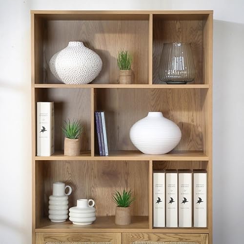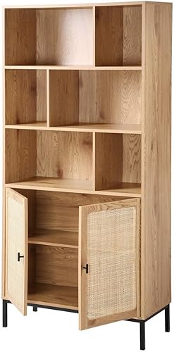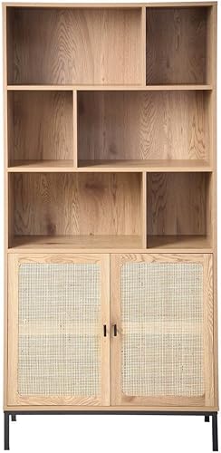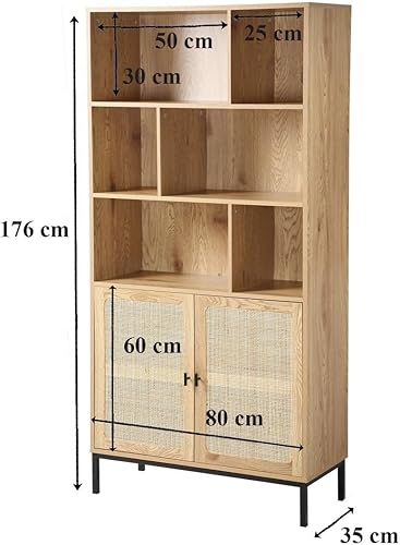 CALICOSY - Bibliothèque 6 Cases 2 Portes Rotin - Décor Bois - Panneaux Particules - Finitions Métal - Étagères, Placards - Séjour, Salon, Chambre - Design Industriel, Exotique - L 80 x P 35 x H 175 cm