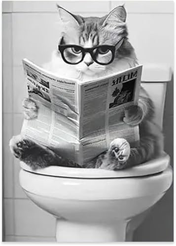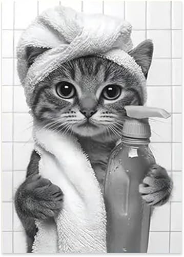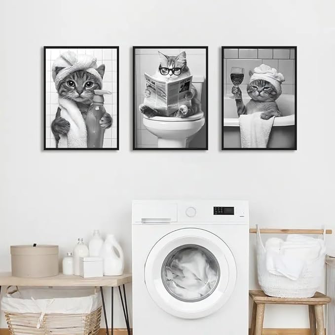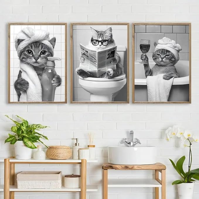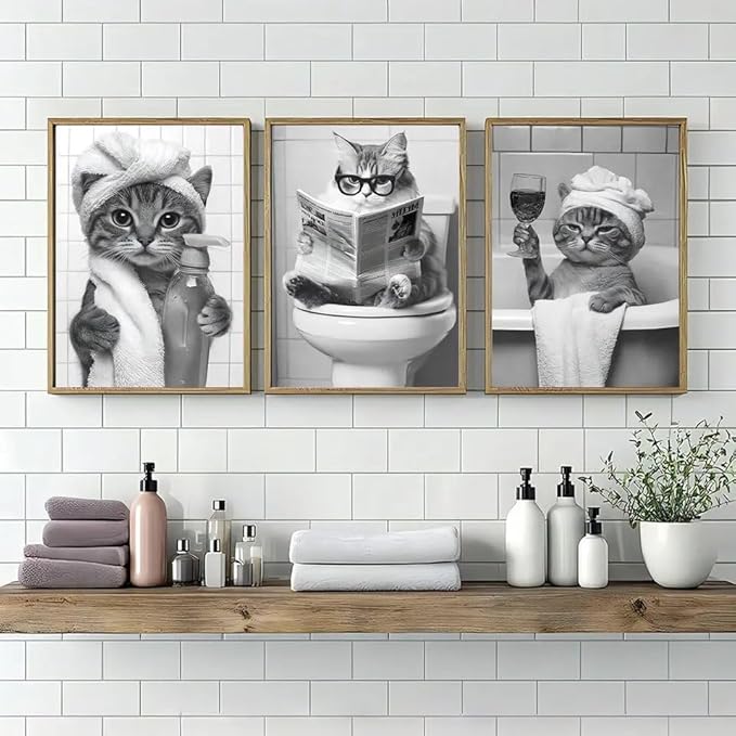 3 Affiche Chat Salle de Bain 30X40CM Poster Humour WC Tableau Decoration Murale Pour Toilette Toile Salle de Bain Affiche Animaux WC Noir et Blanc Poster Rigolo Toilette sans Cadre