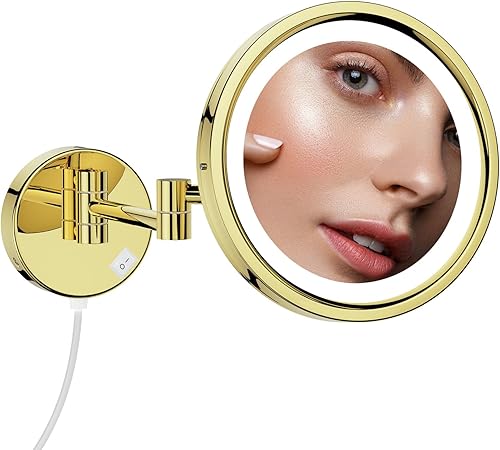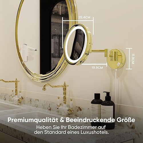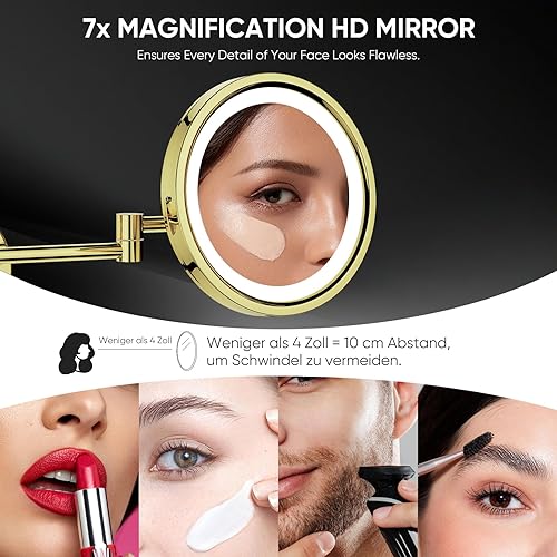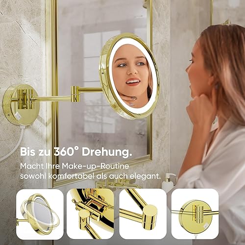 Dowry Miroir Grossissant Mural x7 Miroir Maquillage Lumineux Doré Miroir Extensible Salle de Bain 3 Couleurs de Lumière,Ø 21.5 cm