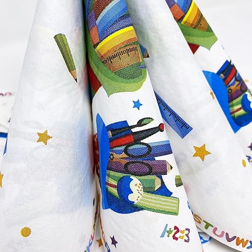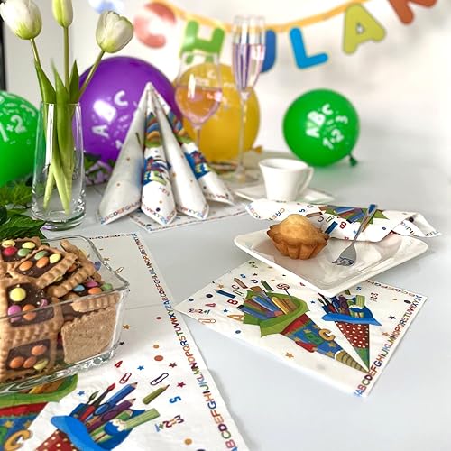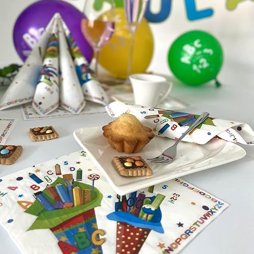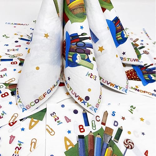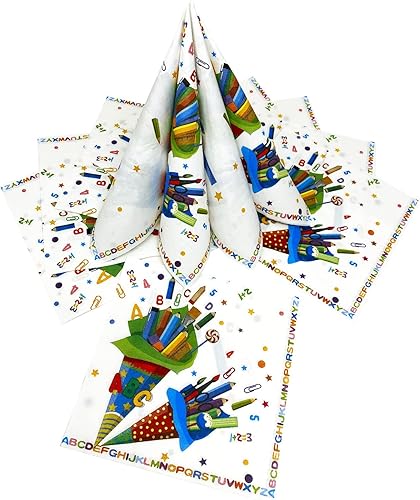 Oblique Unique® Lot de 20 serviettes blanches pour la rentrée scolaire, la rentrée des classes avec sac à sucre ABC multicolore, 1 + 2 = 3 motifs d'école