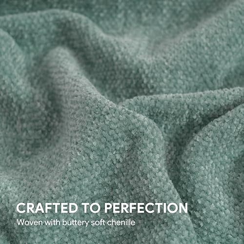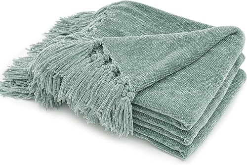 RECYCO Couverture de Canapé en Chenille 127 x 152 cm Avec Franges, Pompons Vert Sauge, Plaid de Noël Moelleux et Doux pour Chaise, Vert Menthe