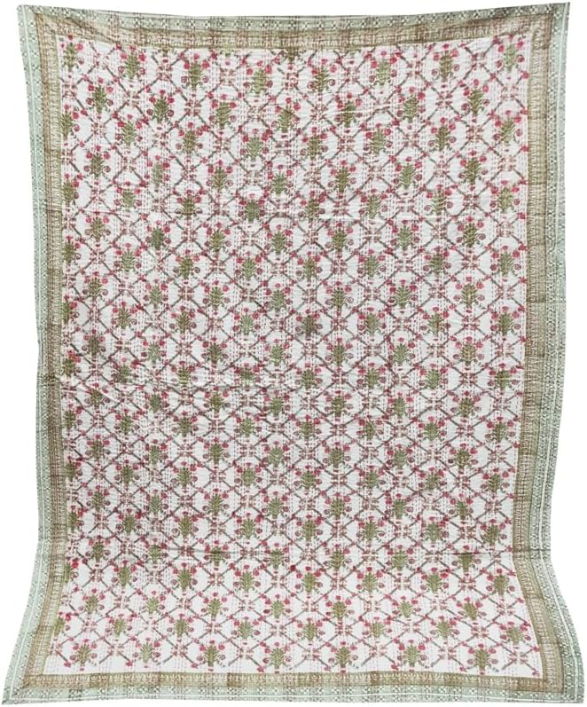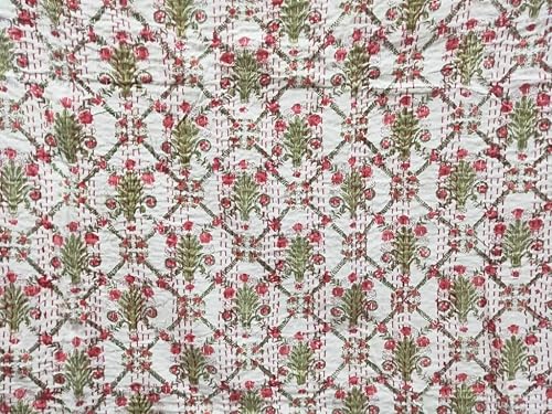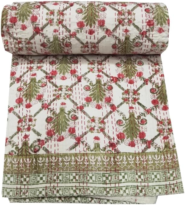 YUVANCRAFTS Couvre-lit Kantha Kantha en coton avec impression indienne (vert et rouge, grand lit, 228,6 x 274,3 cm)