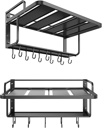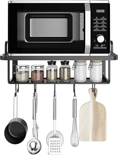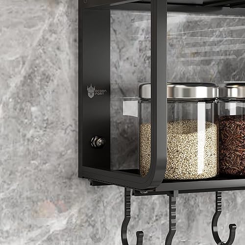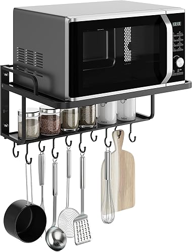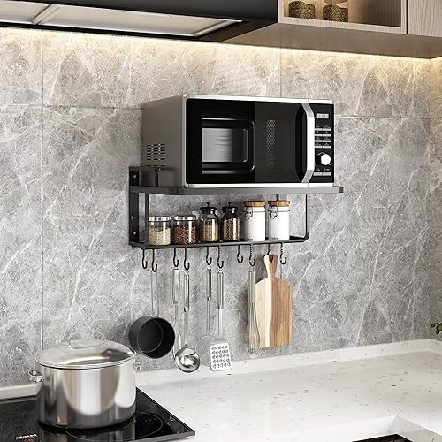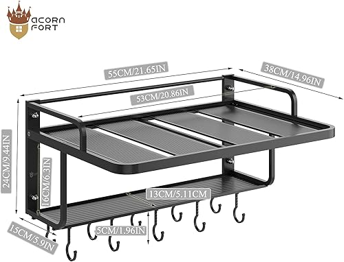 AcornFort® K-102 étagère suspendue en alliage d'aluminium noir à 2 niveaux pour le support de four à micro-ondes support mural avec crochets pour ustensiles cuisine étagère de rangement 10 crochets