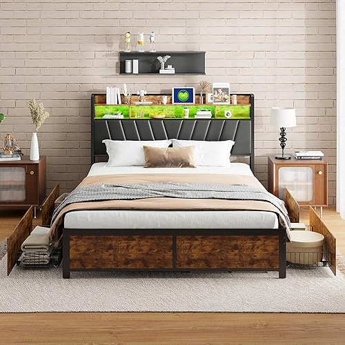 CoziFome Lit 140 x 200 cm avec éclairage LED, lit double en métal, avec prise et fonction de charge USB, cadre de lit 140 x 200 cm avec espace de rangement pour tête de lit en bois, cadre de lit avec