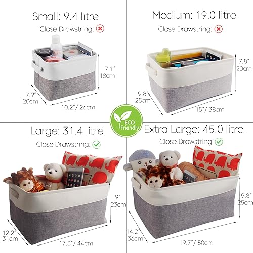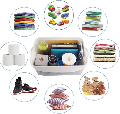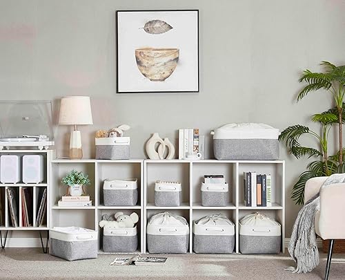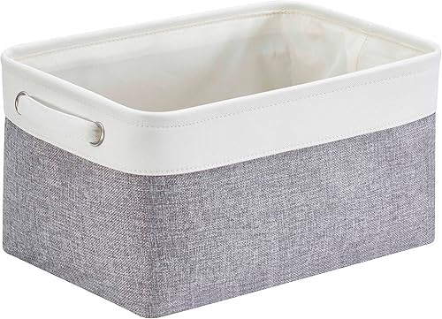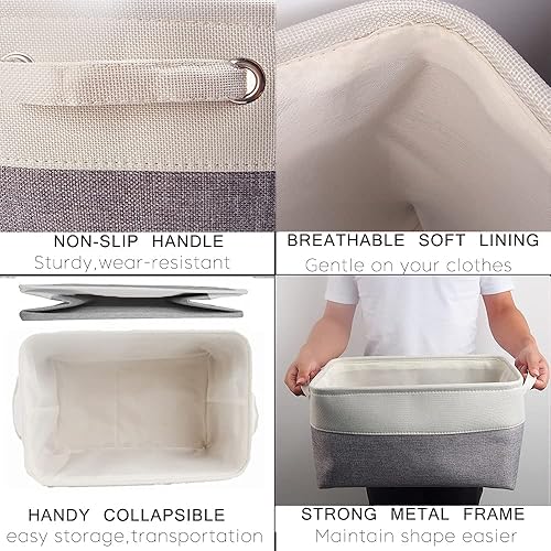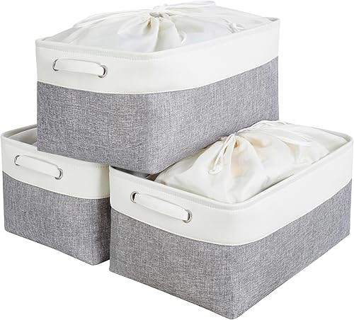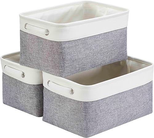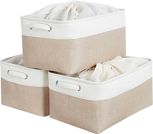 Mangata Petite Panier de Rangement Lot de 3, boites de Rangement en Tissu avec Poignée pour Étagères, Placard, Jouets (Pliable, Blanc Kaki Clair)