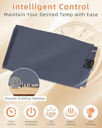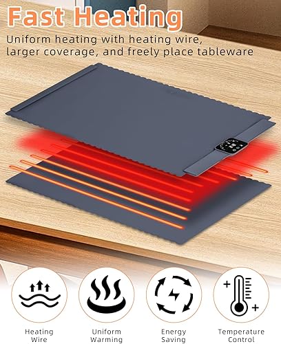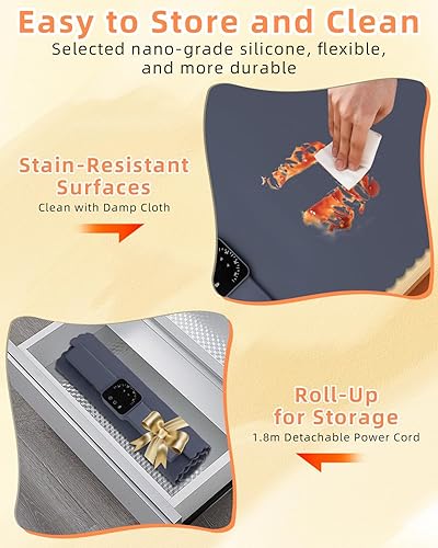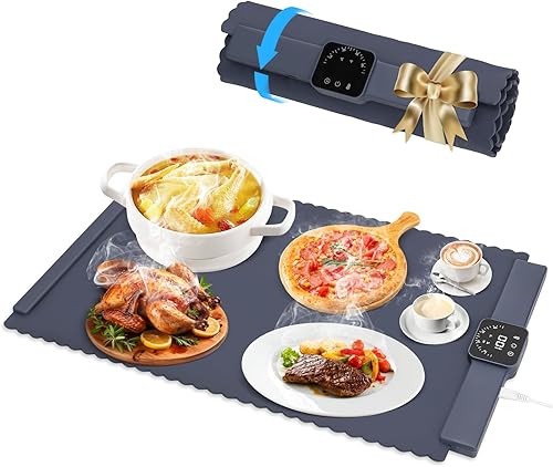 Chauffe Plat Électrique, Plaque Chauffante avec Température Réglable 60°C - 100°C et Minuteur de 4 Heures, Pliable Silicone Chauffe Assiette à Réchaud pour Bithday, Mariage, Fêtes et Buffets Banquet