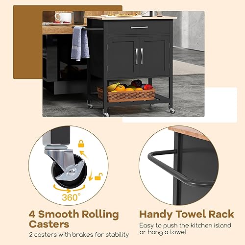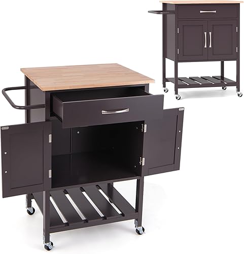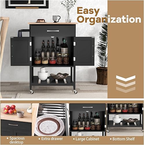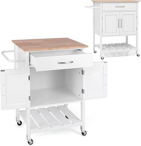 KOMFOTTEU Chariot de Cuisine, 1 Tiroirs & 1 Armoire à Porte, Desserte de Service avec Plan de Travail en Bois Massif, Desserte à roulettes, Plateau inférieur, 73 x 48 x 90 cm (Blanc)