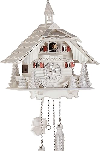 Eble 23096 Horloge à coucou en bois véritable avec mouvement à quartz alimenté par pile Maison de la Forêt-Noire Blanc 30 cm