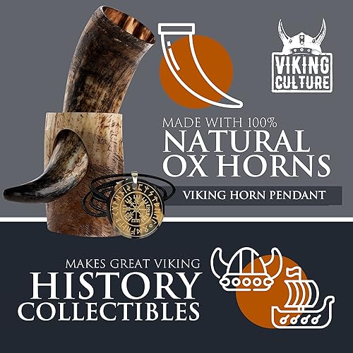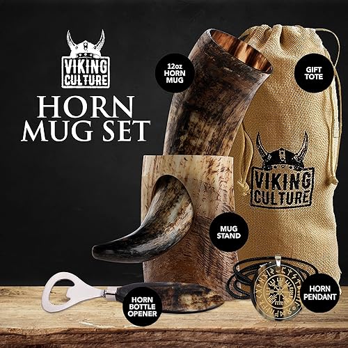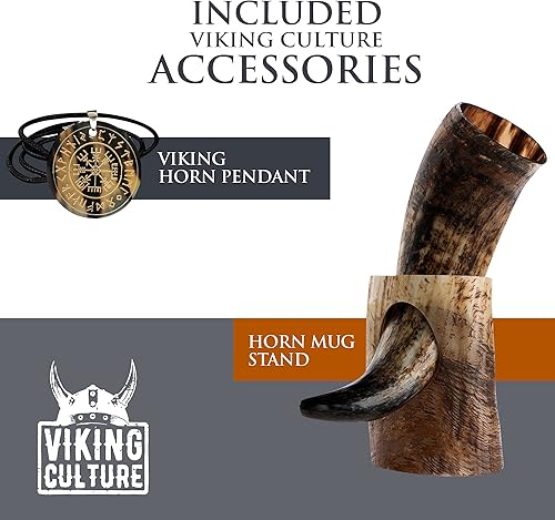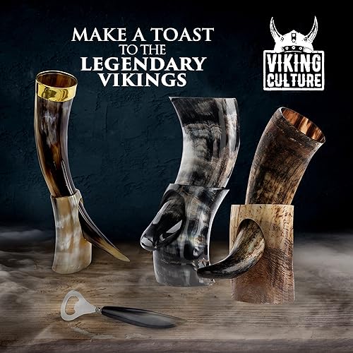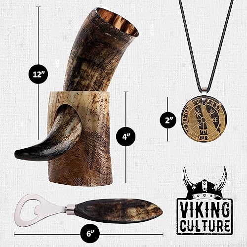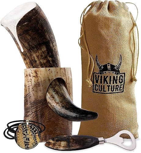 Viking Culture 400 ml Corne à boire Viking avec ouvre-bière, support, pendentif viking et sac en toile de jute vintage, finition naturelle avec authentique style nordique médiéval
