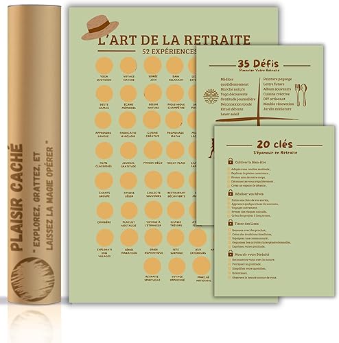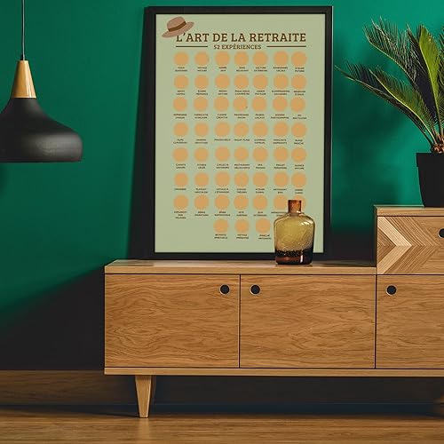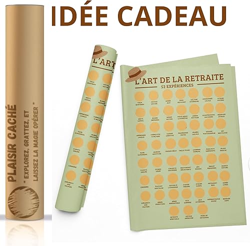 Cadeau retraite femme/homme - Poster à gratter vive la retraite - Format A3 - Encre à gratter dorée agréable et sans traces - 52 activités à faire à la retraite - Idée décoration retraite