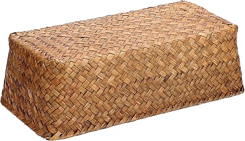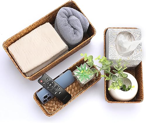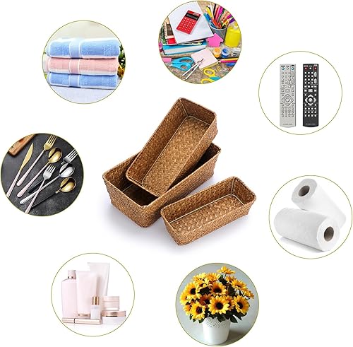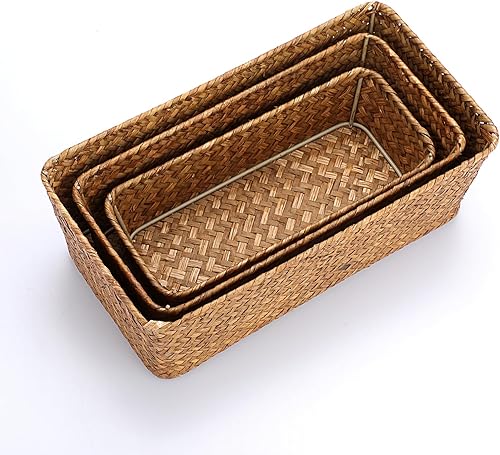 SUMtree Lot de 3 paniers de rangement rectangulaires en jonc de mer en rotin naturel pour étagère de maison (caramel)