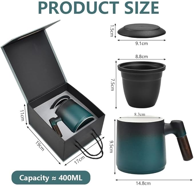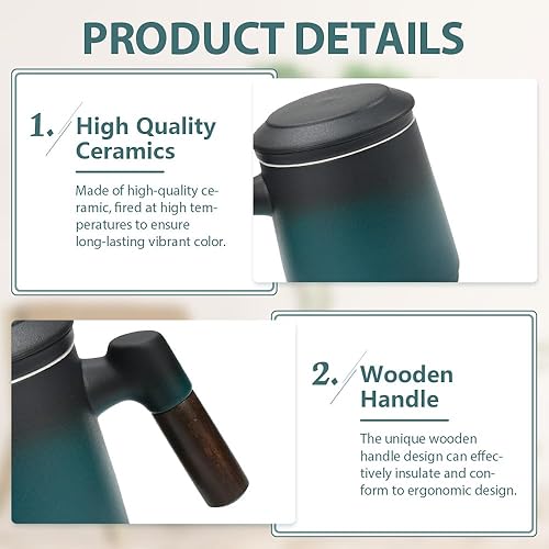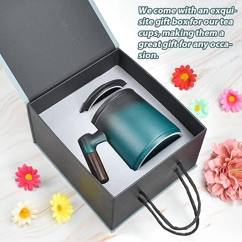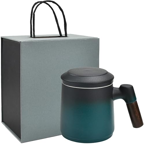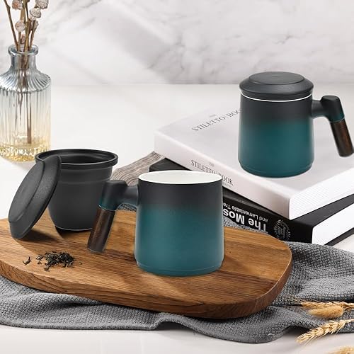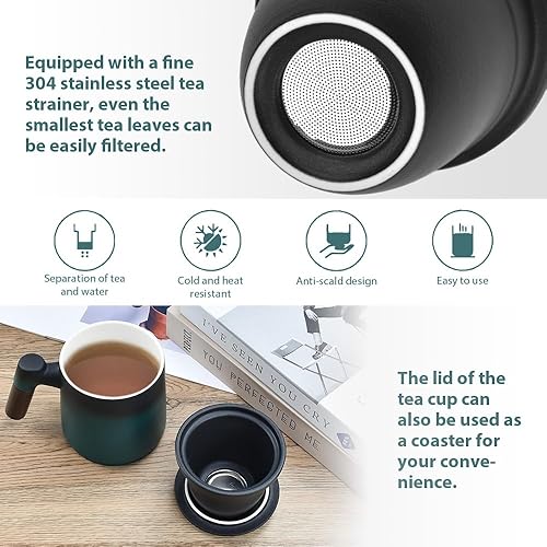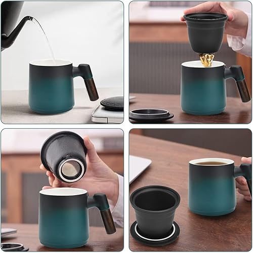 ADERTOS Tasse à Thé en Céramique avec Infuseur et Couvercle Tasse en Céramique avec Poignée en Bois Tasse à Thé avec Couvercle et Passoire Tisanière avec Filtre en Acier Inoxydable pour Maison(400ML)