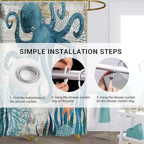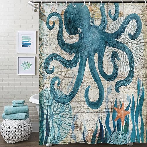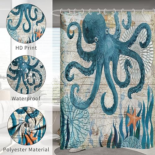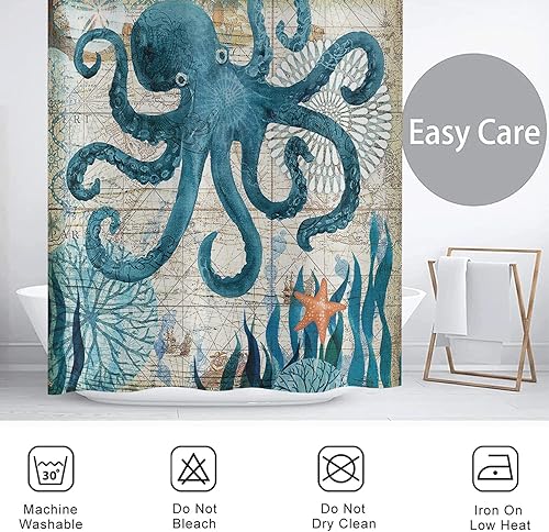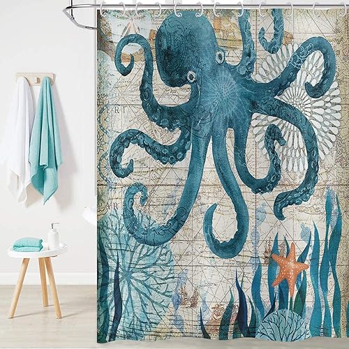 Hnmdmyi Rideau de Douche Océan Nautique 180x200, Turquoise Pieuvre Drôle de Rideau de Bain Vintage Carte du Monde Plage Récif Corallien Côte Etanche Tissu Lavable Rideau de Bain avec Crochets