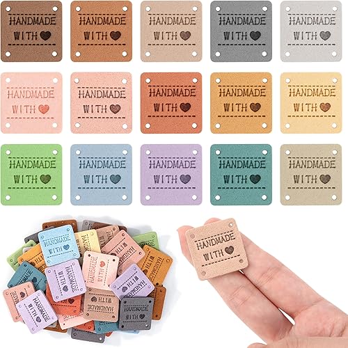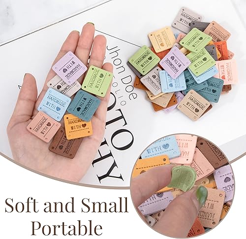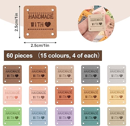 Étiquettes Faites à la Main à Coudre, Lot de 60 Étiquettes en Cuir PU, Étiquettes Relief Fabriquées Main avec Trous, Étiquettes de Couture pour Vêtements, Tricot, Bricolage, 15 Couleurs