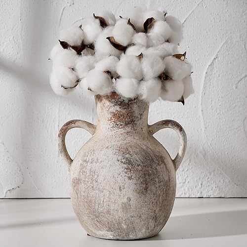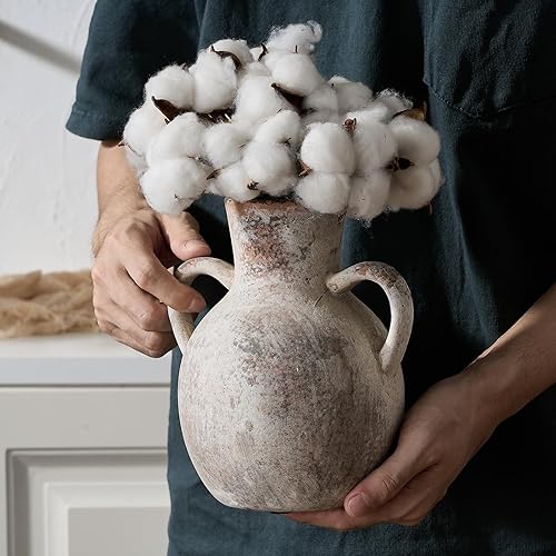 SIDUCAL Vase à fleurs rustique en céramique avec 2 poignées, vase en terre cuite blanchie à la chaux pour décoration d'intérieur, table, salon, étagère, 18 cm, terre cuite